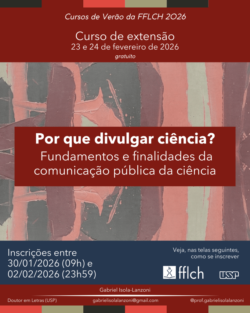 No dias 23/02 e 24/02, oferecerei um curso de extensão, vinculado ao projeto ‘Cursos de Verão FFLCH 2026‘.